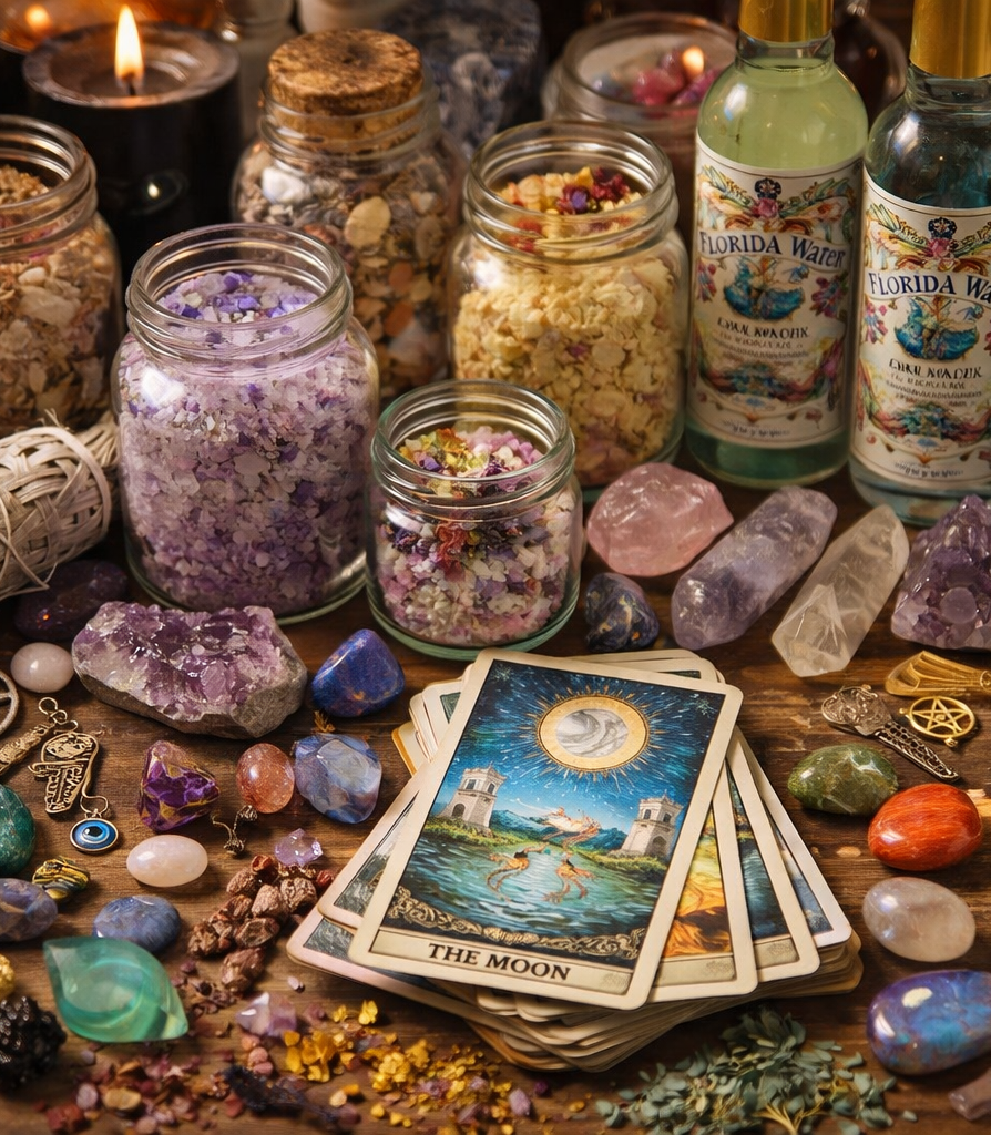 Contamos con una amplia variedad de herramientas ritualizadas para potenciar tu intención: desde Aguas Floridas artesanales y colonias de limpieza, hasta hierbas sagradas, resinas puras y aceites de alquimia. Son el complemento ideal para quienes buscan profundizar en su espiritualidad a través de hechizos, limpiezas de hogar y meditación.